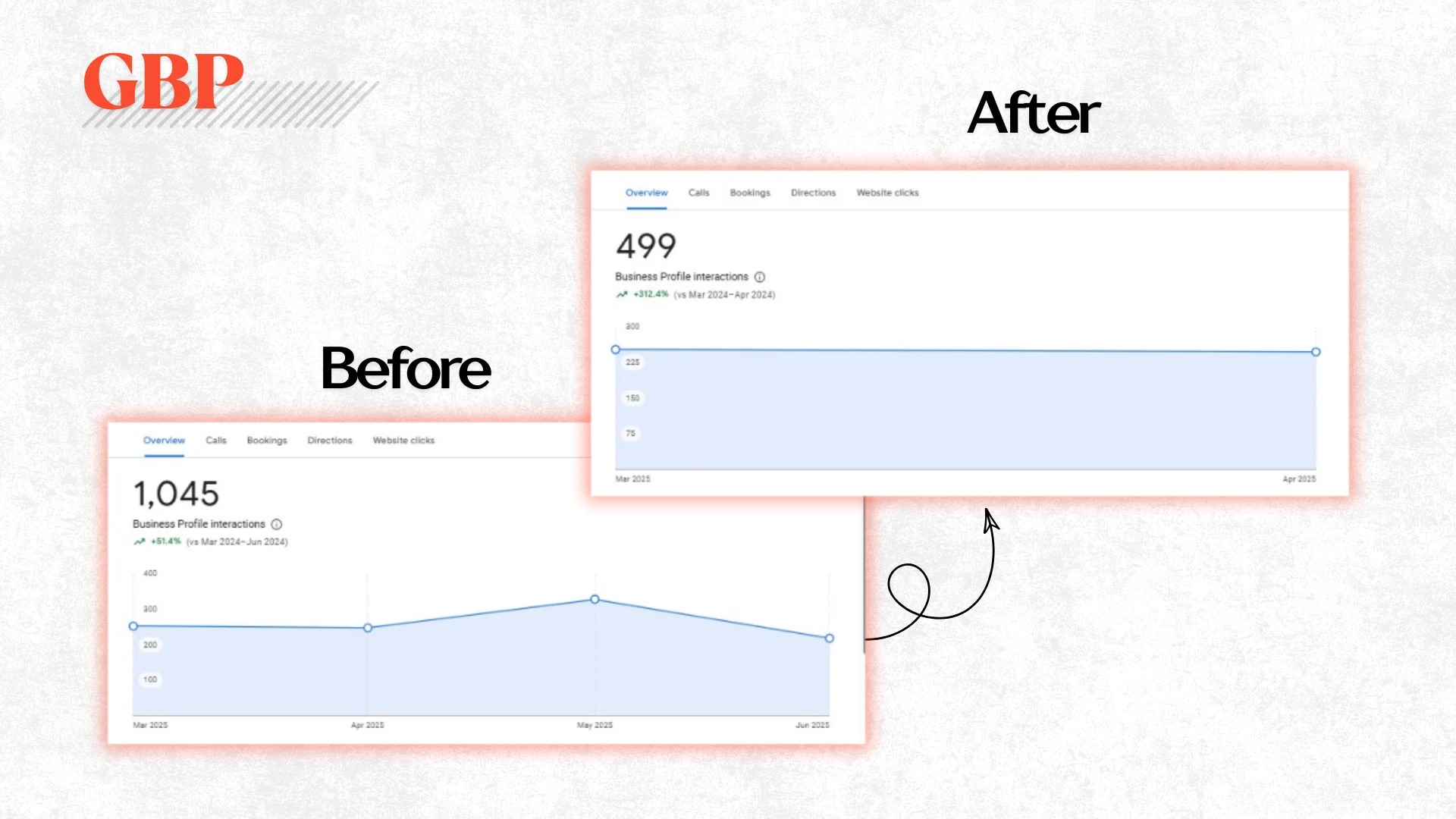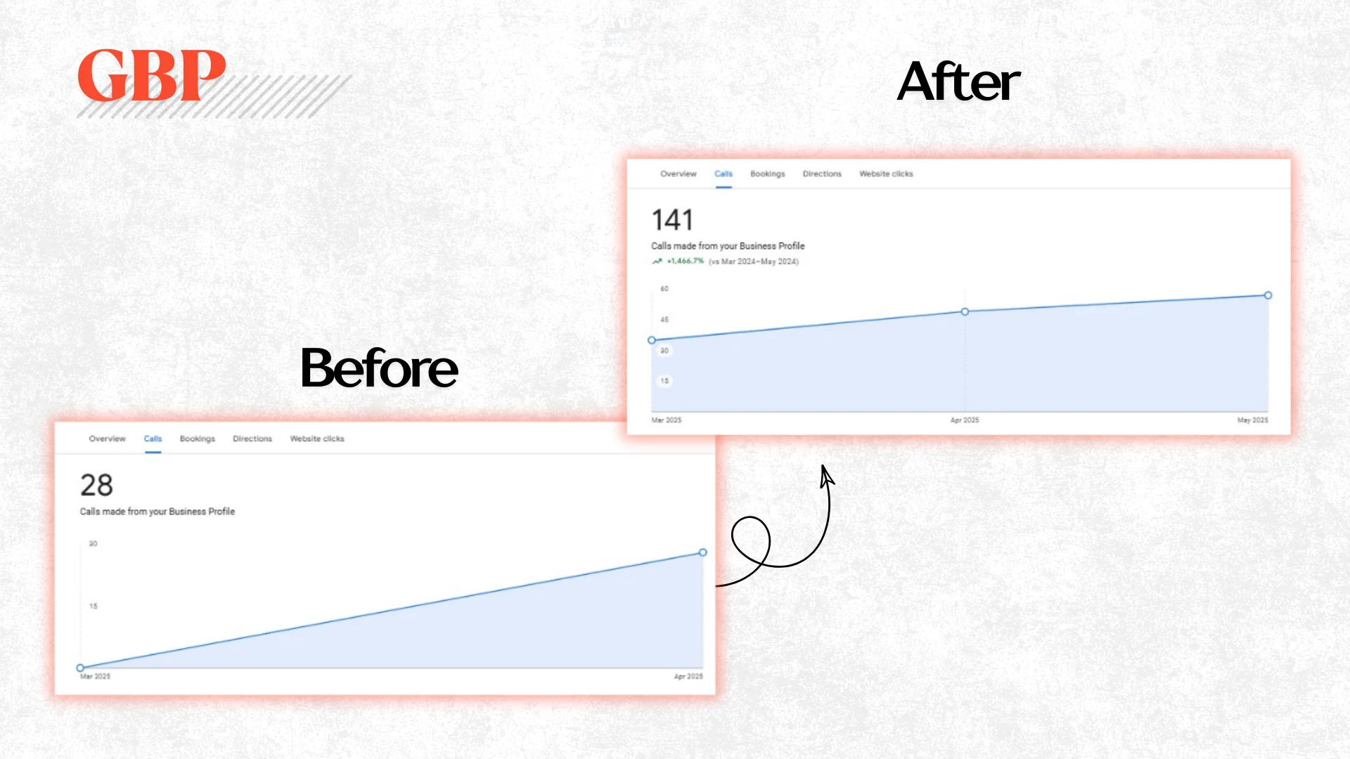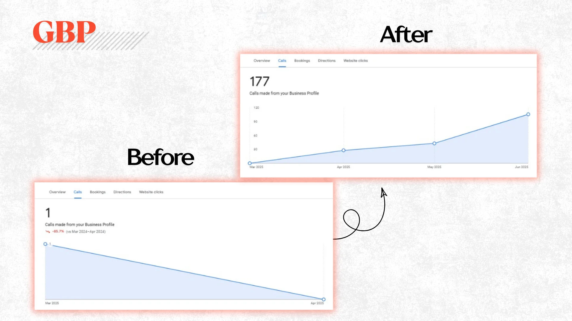 • Before & After Screenshots: Show real examples of the impact, like before/after GMB ranking or website traffic.