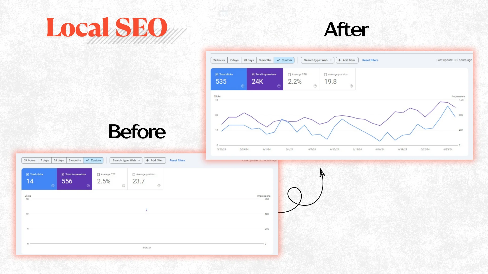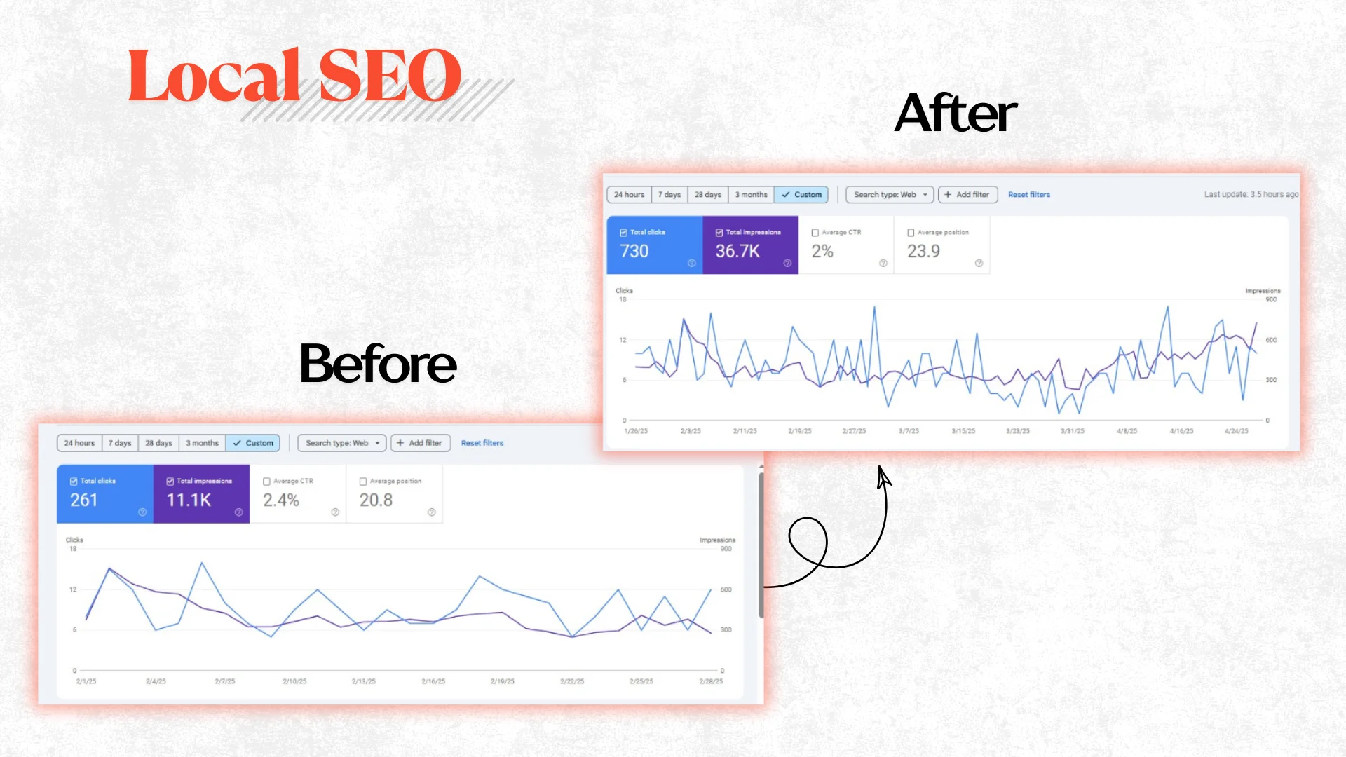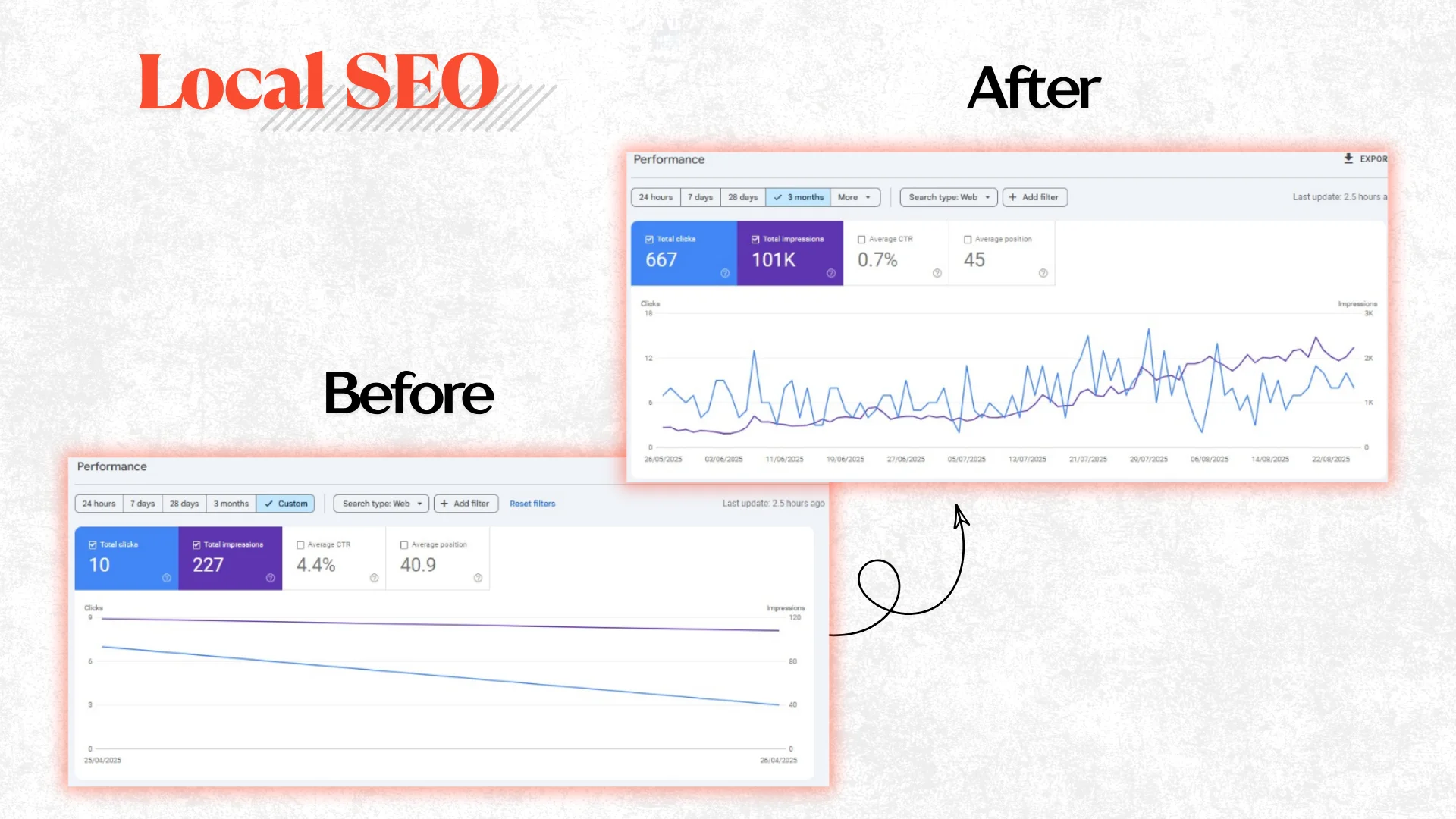 • Before & After Screenshots: Show real examples of the impact, like before/after GMB ranking or website traffic.